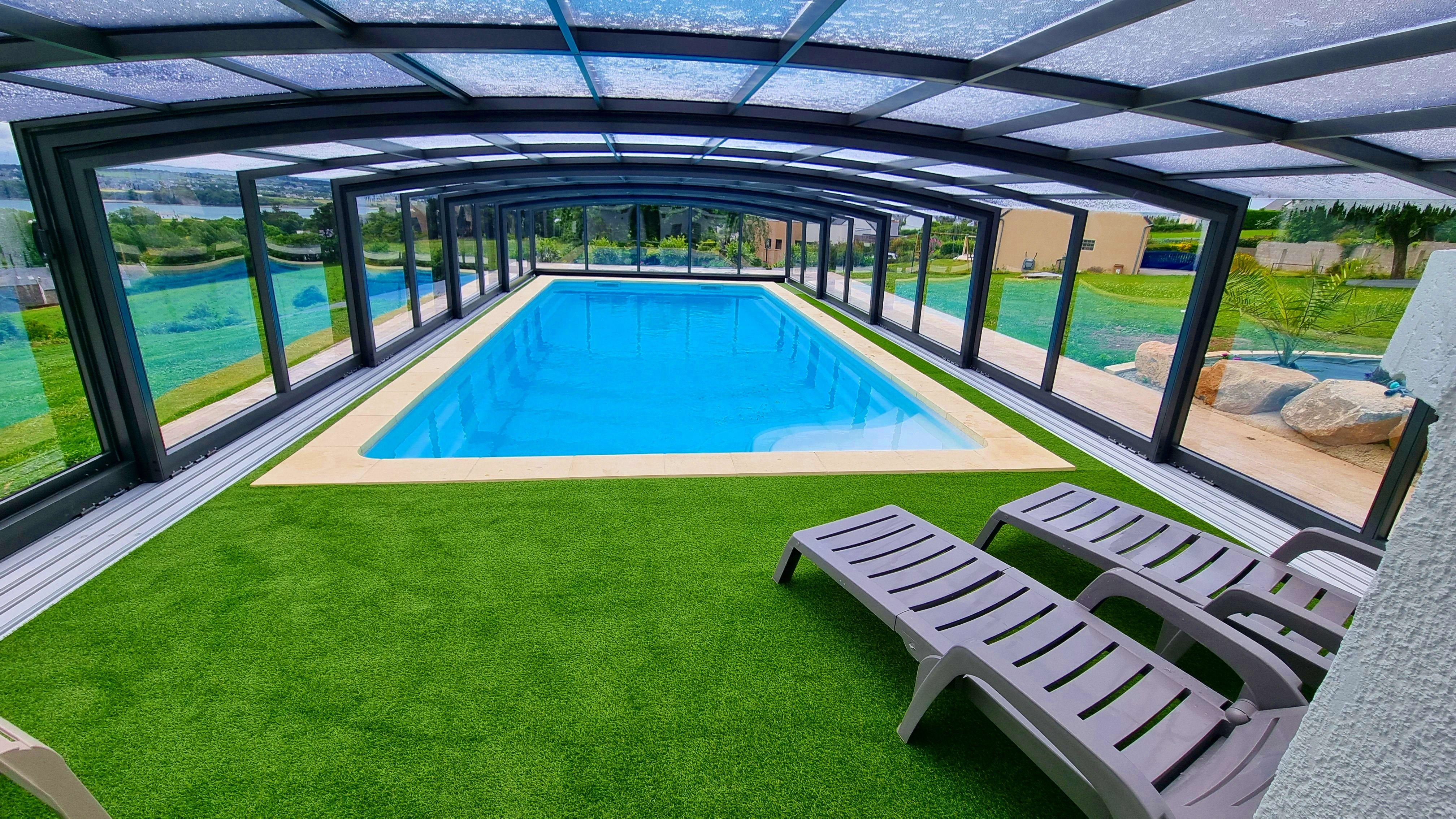 Piscine intérieure chauffée toute l’année avec accès direct depuis la maison, terrasse panoramique, grand terrain de 5000 m² exposé plein sud et plage accessible en moins de 10 minutes à pied.